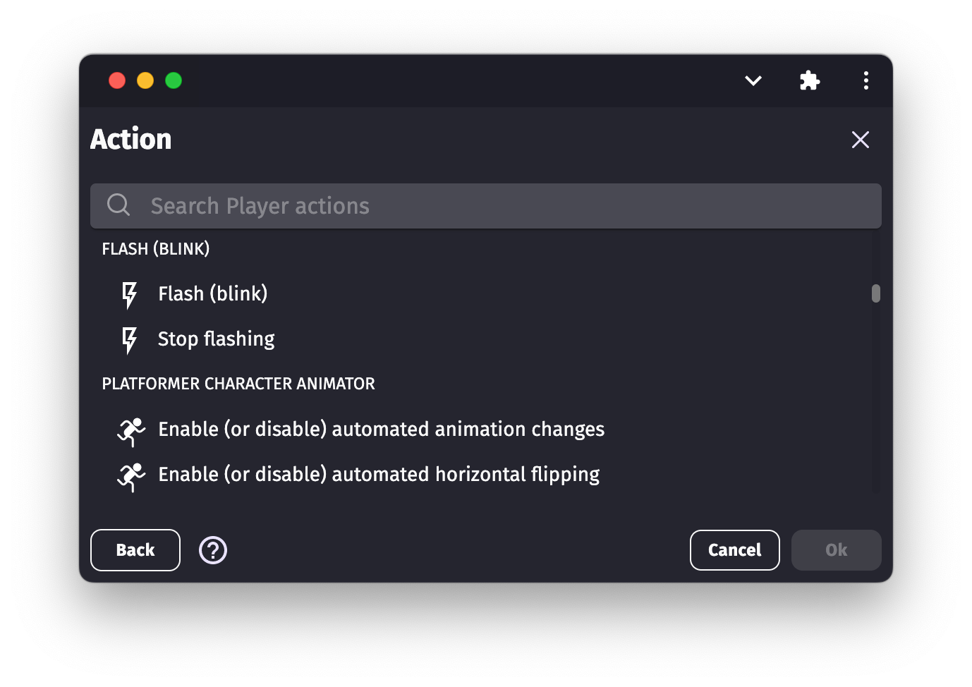 • Even if no behavior is provided, you'll have some actions or conditions. Find them in the list of actions or conditions when editing an event. The name of the category containing them is the same as the extension.