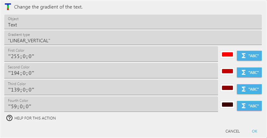 • You can create gradients using the action "gradient". You can choose available gradient types from the provided list and select up to four colors to use.