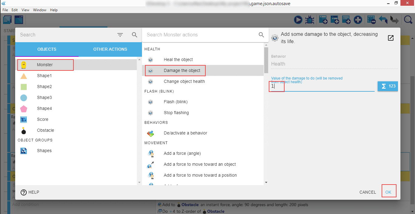 The action "Delete an object" will remove the "Obstacle". Whenever a bomb hits the Monster, it will be deleted from the game.