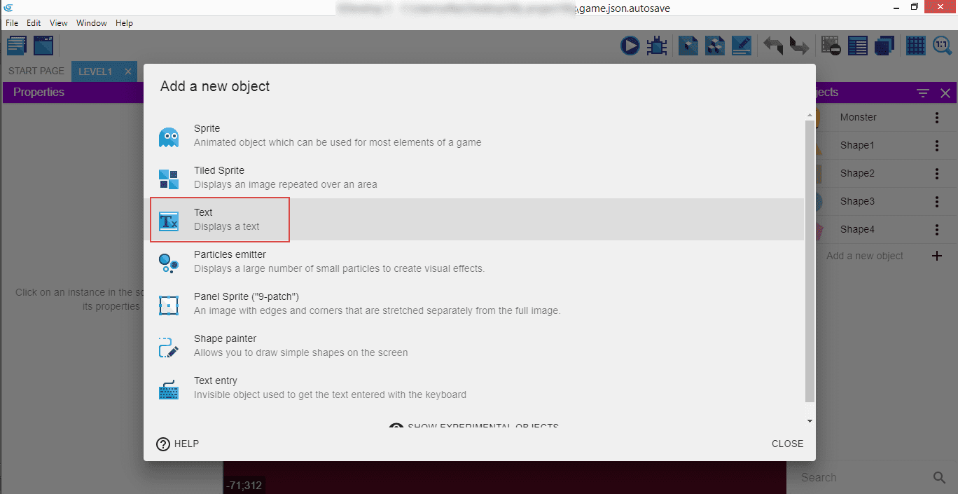 Go to the "Level1 (Events)" tab, click "Add an action", and in the popup select our new "Score" variable, look for "Modify the text", and in the right panel select "Modification's sign" to = (set to), with the text "Score: " + ToString(Variable(Score)).