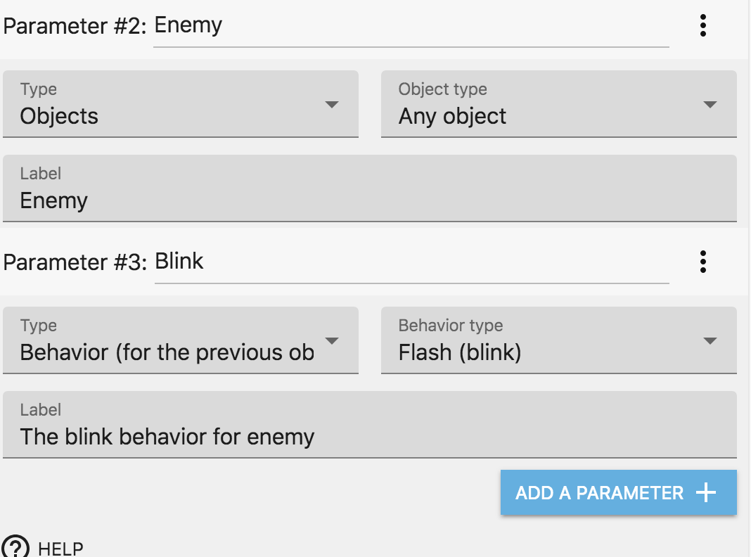 Navigate to the function "Parameters" tab and in the bottom choose "Add a parameter". Then, enter "Enemy" for the parameter name, then "Objects" for the type. You can enter "Enemy" as the label too (this is what will be displayed when you add the action in the scene events sheet).