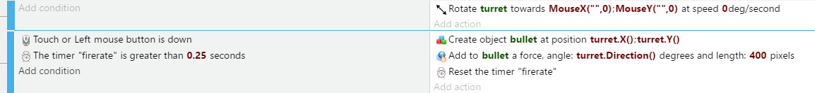 This pair of conditions and actions will ensure that the actions used to fire the bullet are repeated when at least 0.25 seconds have elapsed since the last bullet was created.